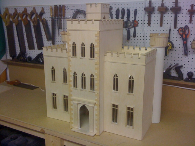1 inch scale. It measures approx 32" wide, 14 1/4" deep and 32 1/2" to the highest point. Ships flat packed. Requires assembly and paint touch up if you select painting. Touch up paint, brads supplied. Select 'Finished" for painted exterior, interior unfinished. Select "Un-Finished" for no painting. You will receive a raw wood castle.